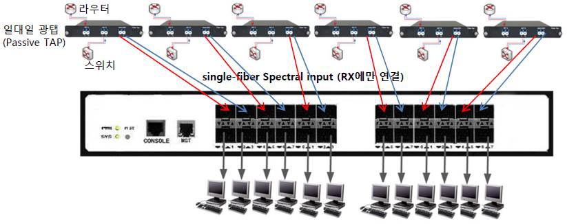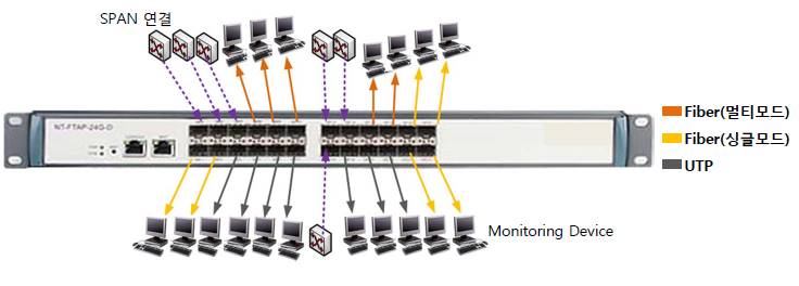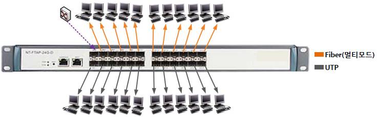 1x23 SPAN Regeneration탭 ~ 1개의 input, 23개의 output, 11개의 멀티모드 광과 12개의 UTP로 모니터링 디바이스 연결