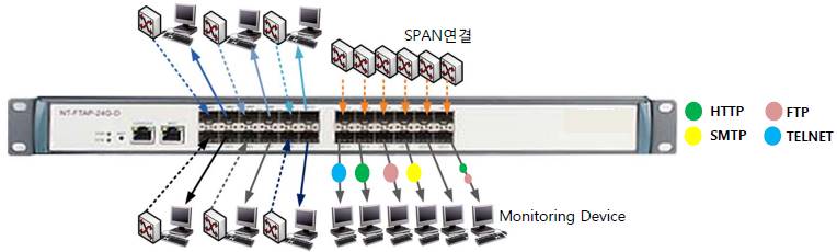 전체 포트(SFP) 24개는 SPAN Input이나 Output으로도 설정이 가능하다. 모니터링 포트(SFP)는 모니터링 디바이스를 연결하여 원하는 네트워크 데이터를 모니터링 할 수 있다. SFP방식으로 다양한 방식의 인터페이스를 지원한다.