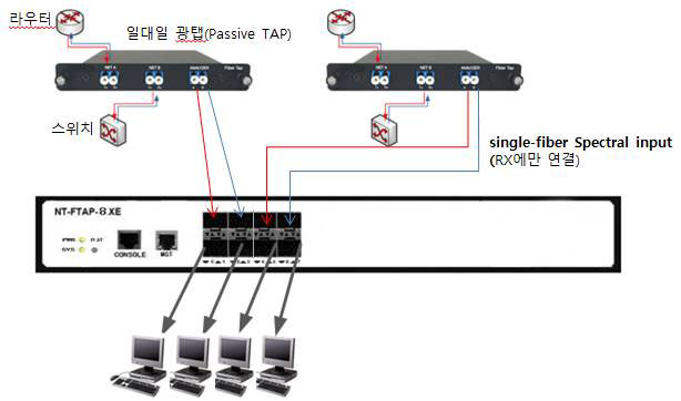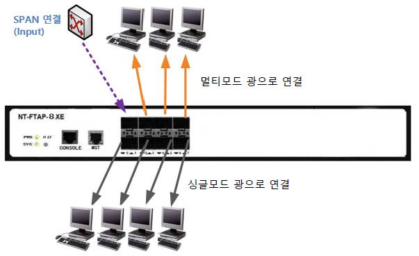 1x7 SPAN Regeneration탭 ~ 1개의 input, 7개의 output, 3개의 멀티모드 광과 4개의 싱글모드 광으로 모니터링 디바이스 연결