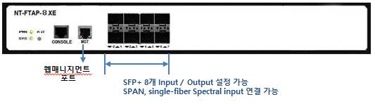 1개의 탭으로 4X4 미러링(SPAN)탭, 7X1 SPAN Aggregation TAP, 1X7 SPAN Replication TAP 등등으로 사용 가능하다. 네트워크 포트와 모니터링 포트를 Input 또는 Output포트로 설정이 가능하기에 다양한 설정을 할 수 있다. 또한 포트마다 멀티모드 광 또는 싱글모드 광으로 각각 인터페이스를 선택 가능하다. Output(모니터링) 포트는 전체 혹은 특정 데이터만을 선택하여 모니터링 하길 원하는 데이터만을 모니터링 할 수 있다.(어플리케이션 참조)